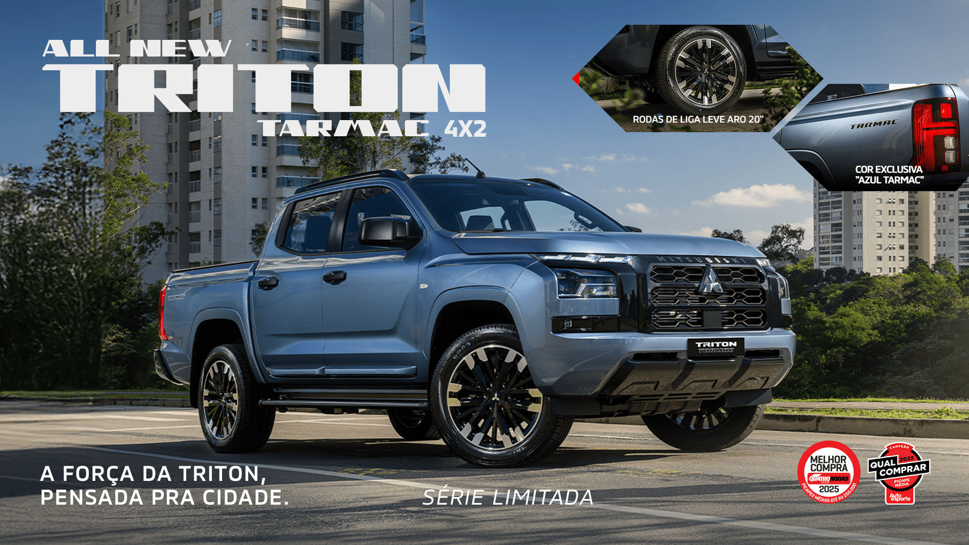 Robustez e tecnologia da Nova Triton, agora com um visual pensado no asfalto: Tarmac. Rodas de 20", faróis de LED e a exclusiva cor Azul Tarmac destacam o design forte e a presença que impõe respeito. Por dentro, bancos com acabamento em suede e sistema de som assinado JBL. Por trás do visual, o motor 2.4 Bi-Turbo Diesel com 205 cv mantém a força que já é marca registrada. Mesma robustez, novo cenário. Feita para quem vive a cidade sem abrir mão da essência Triton.
